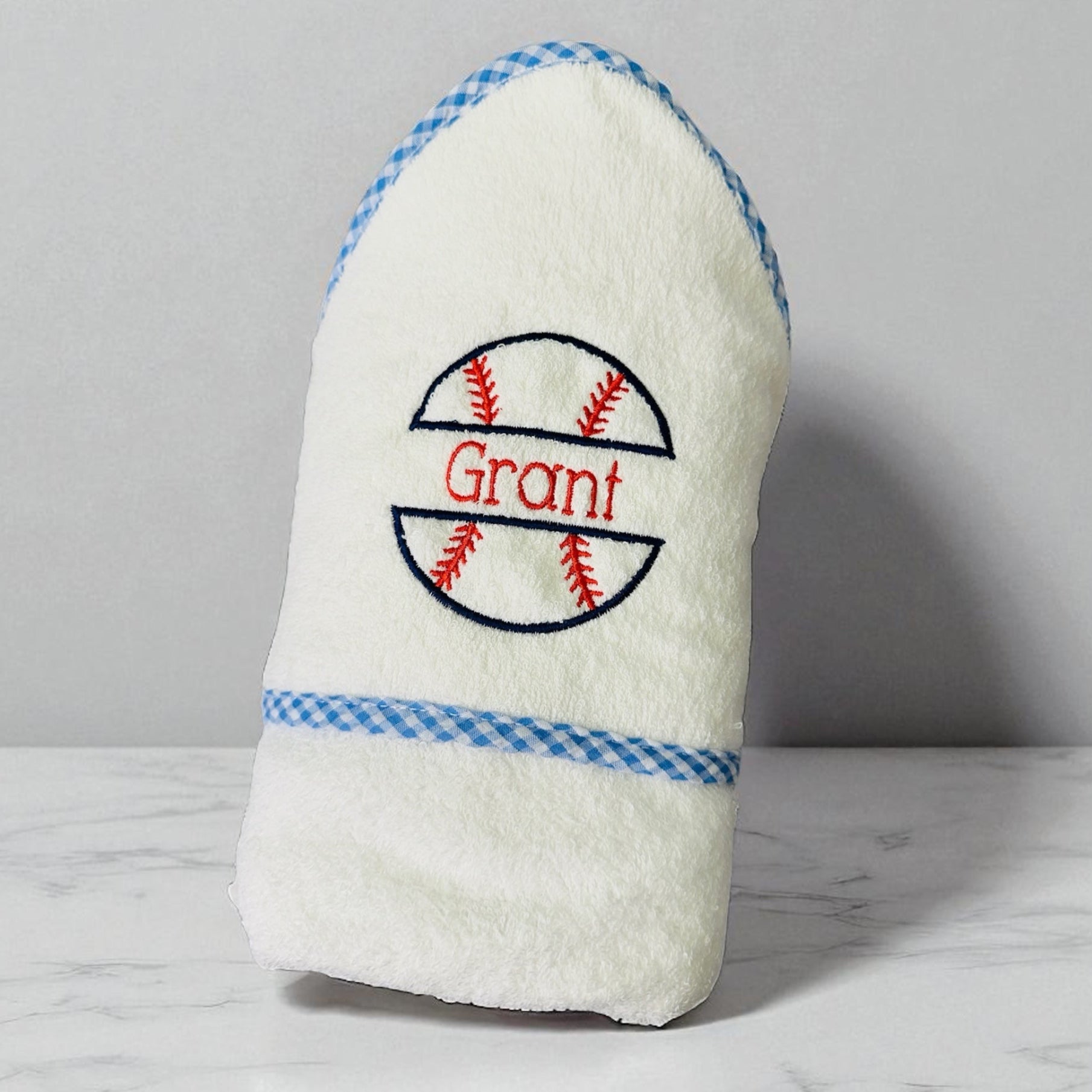 Keep baby cozy and dry with a personalized Baby Bath Towel. These white towels are trimmed in gingham check and made of 100% Cotton. They measure 32" x 32".