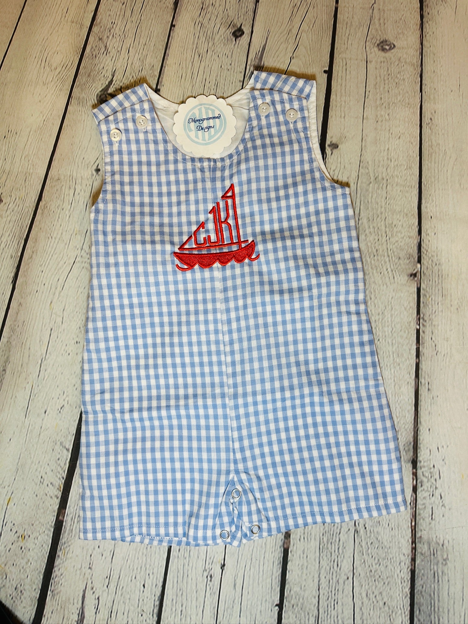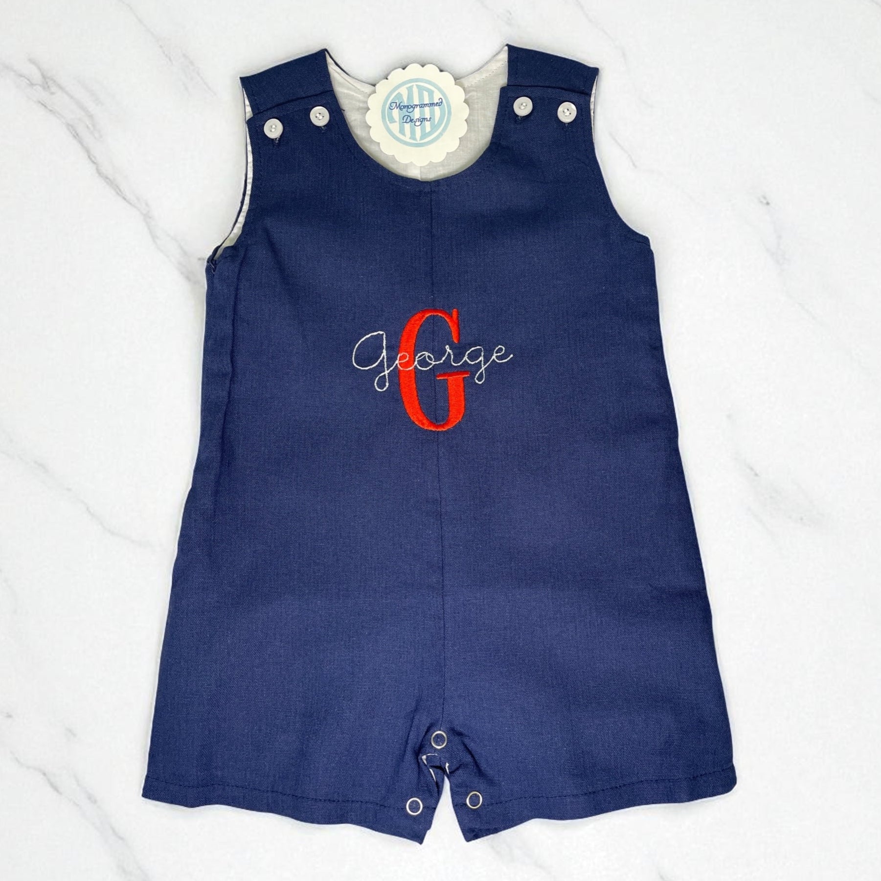 A classic little boy's fully lined Jon Jon. Choose between gingham, seersucker or solid. Comes in Navy or Light blue gingham. Navy seersucker. Navy and Light blue solid. Snaps at the crotch, double buttons on the straps, and both the lining and seersucker are 100% cotton. Can be monogrammed with a name or initials.